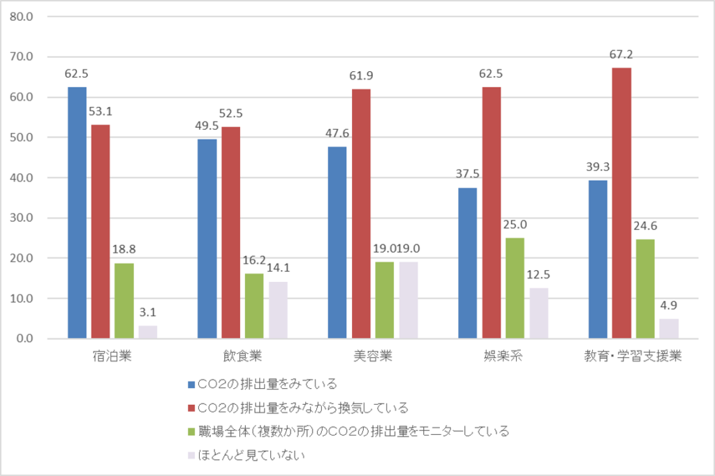 センサーの使用法については全業種において CO2 の排出量を見ているだけでなく「CO2 の排出量をみながら換気をしている」という行動の動機づけにしている状況がわかります。