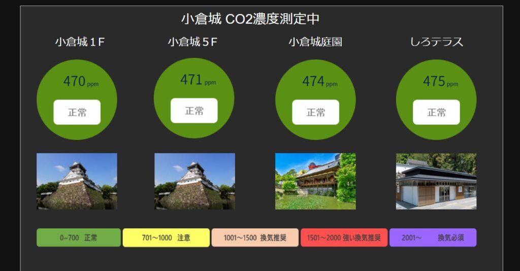 当社は小倉城・小倉城庭園・しろテラスの3施設に4台のCO2濃度測定センサーを導入し、SensorCorpusにより入場者が各施設の現在のCO2排出量を見えるようにしました。また施設の管理者は管理画面により各施設のCO2排出量の増減の様子を時系列でモニタリングできる仕組みを作りました。
