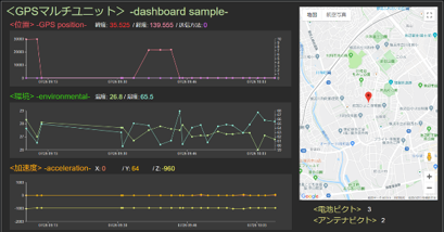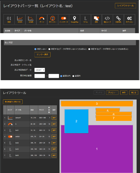”SensorCorpus“で収集したセンサーデータをさまざまな形式で表示することが可能な機能です。豊富なレイアウトパーツを画面上に張り付けて、利用者毎に適切なダッシュボードを自由に作成する事ができます。