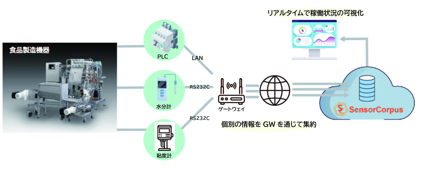 ゲートウェイに集約し「Sensorcorpus」に格納。 - リモートでリアルタイムの稼働情報を可視化させる。