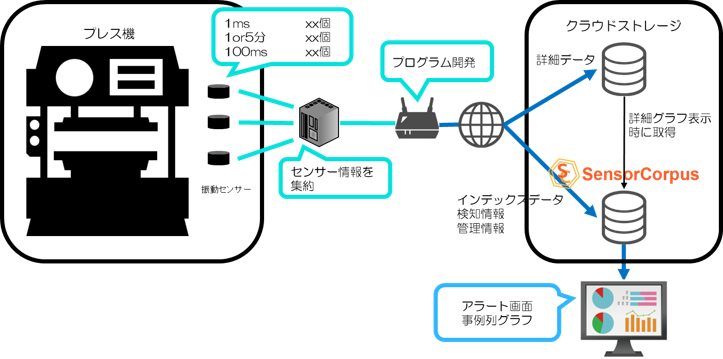 プレス機器のメンテナンスにおいて、振動データなどを収集・可視化し、異常値を検知するサービス基盤を構築。