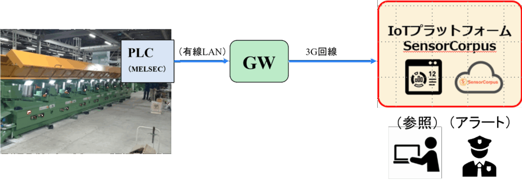 IoTプラットフォーム「SensorCorpus」を活用し、伸線機の稼働データやアラート情報を可視化するシステムを構築。