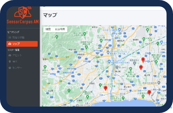 アセットの位置情報を詳細に表示。地図上のマーカーをクリックすると吹き出しが表示されてアセットの状態(アセット名、稼働状況)が確認できる。