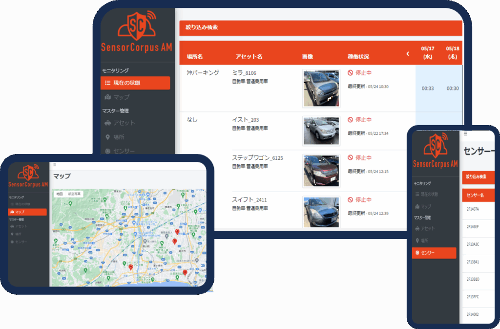 自動車整備業の株式会社ヤベ自動車工業様(神奈川県藤沢市)では、自社保有の代車がどこにあるのか分からない、台帳上の情報と実際に駐車している場所が必ずしも一致していない(台帳に入力することが手間)などの課題がありIoT活用を検討されていましたが代車に搭載するデバイスは駐車中ではセンサーの電源が取れない、電池残量が無くなってしまうと位置情報が取れないため、頻繁に充電をする必要がある等で悩んでいらっしゃいました。SensorCorpusAMの導入でこの課題を解決され見つけたい代車をすぐに発見できるようになり大幅な作業効率を実現しました。