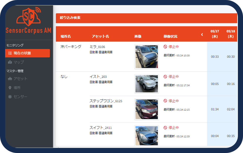 自動車整備業の株式会社ヤベ自動車工業様(神奈川県藤沢市)では、自社保有の代車がどこにあるのか分からない、台帳上の情報と実際に駐車している場所が必ずしも一致していない(台帳に入力することが手間)などの課題がありIoT活用を検討されていましたが代車に搭載するデバイスは駐車中ではセンサーの電源が取れない、電池残量が無くなってしまうと位置情報が取れないため、頻繁に充電をする必要がある等で悩んでいらっしゃいました。SensorCorpusAMの導入でこの課題を解決され見つけたい代車をすぐに発見できるようになり大幅な作業効率を実現しました。